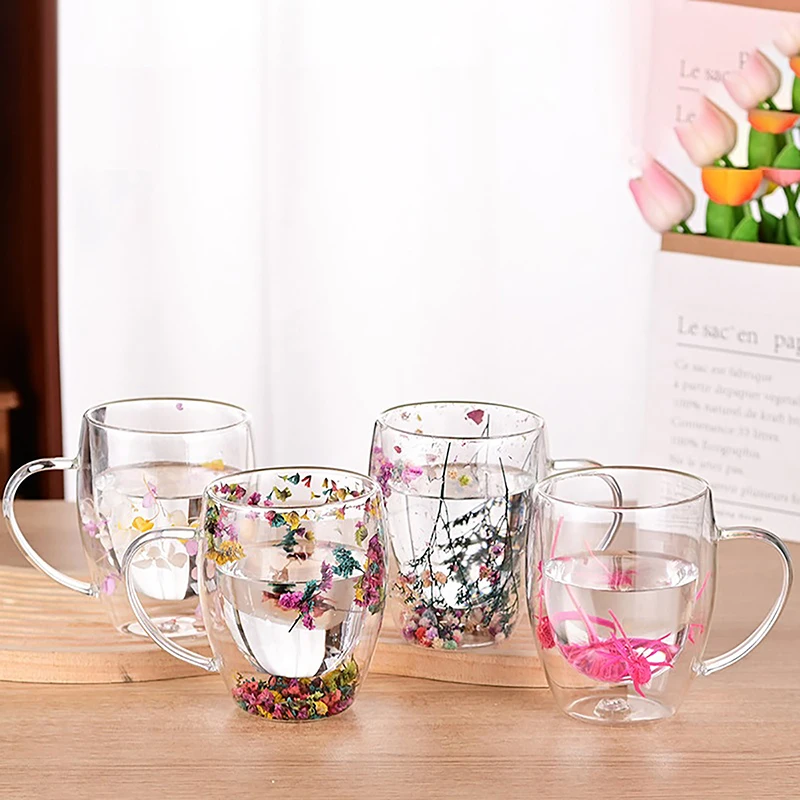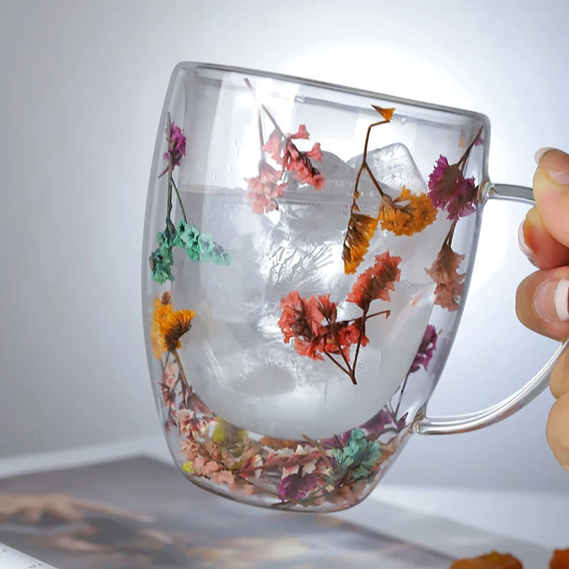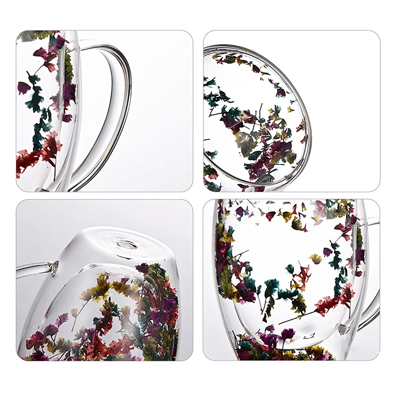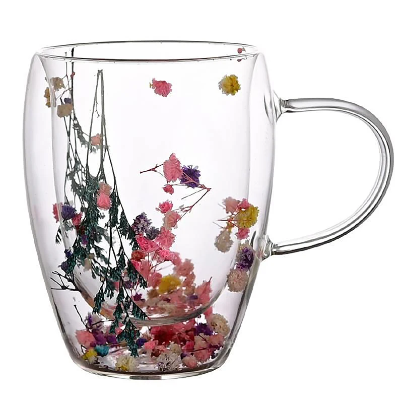 2. Dry Flowers Double Wall Glass Cup has a thickened bottom design that increases the stability and safety of the cup, and an ergonomic handle that provides a comfortable grip and protects your fingers from burns.